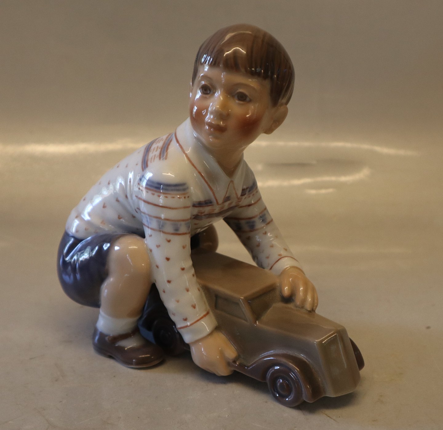 Dahl Jensen 1166 Dreng med bil 14 cm (DJ). Mærket med kongelig krone og DJ Copenhagen i hel og fin stand.