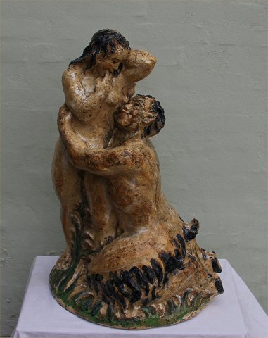 Den ultimative faune figur af Knud Kyhn er denne unikke gruppe af en faun der omfavner nøgen kvinde, mens han knælende ser begejsret op på hende. Man kan tydeligt se de karateristiske faunetræk: hove, hale og små horn. Skulpturen er mærket med den Kongelige Porcelænsfabriks tre bølgelinier, KK signaturen og 1931. Den måler ca 71 x 50 cm og vejer ca 33 kg selv om den er hul inden i. Dekorationen er i lette, klare farver i modsætning til den tradtionelle sung glasur og der er hvad man må forvente af udekorerede områder og krakkeleringer, samt et mindre afslag. Den vil krone enhver samling af Faune eller Kyhn figurer.