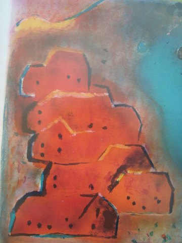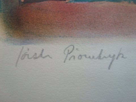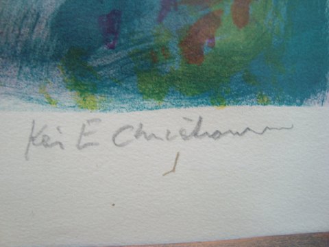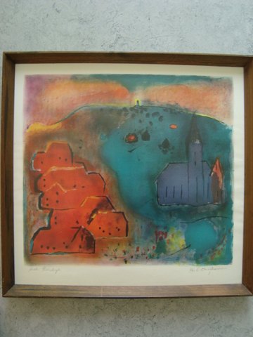 Første prøvetryk - Kai E. Christiansen - Landskab med gårde og kirke.