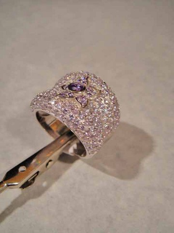 Med lilla krystal i midt omkranset af talrige brillant slebene krystaller.