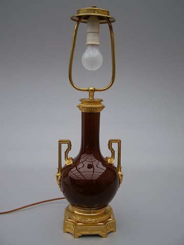 Fransk bordlampe af porcelæn med påsat broncemontering, h:64cm. med skærm