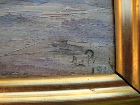 Maleri af ubekendt kunstner - Kystparti med huse og både i havn - Nordsjælland??