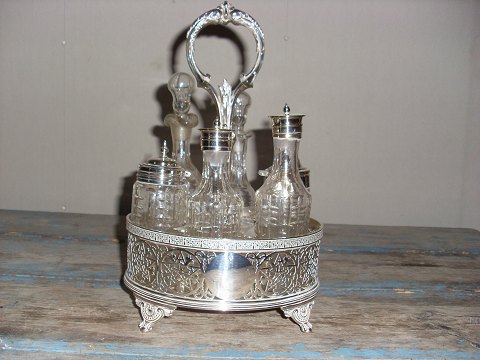 Stor plat de menage med seks flasker,