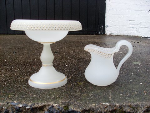 Sukker fad og flødekande i hvid opaline med guld dekoration.