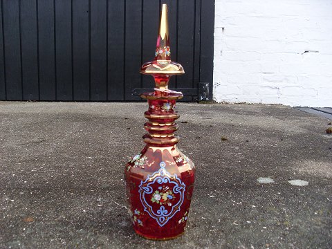 Smuk karaffel i rødt glas med emalje bemaling.