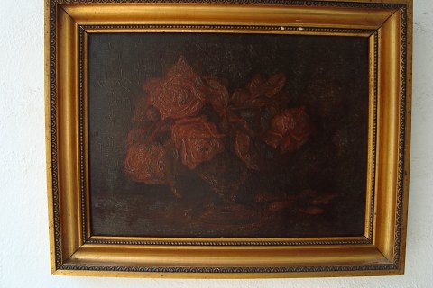 Text available in Danish: Gammelt olietryk/maleri med Roser i opsats.