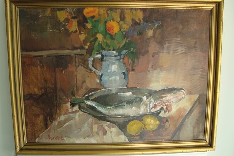 Nature Morte med torsk, blomster i vase og citroner på bord.
