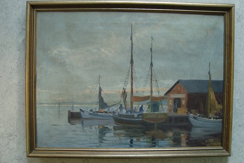 Maleri af Gustav P. Rimmer 1939 - Fiskekuttere i havn losser fisk.
