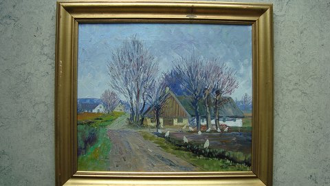 Maleri af Einar Landberg - Landskab med gård og høns.