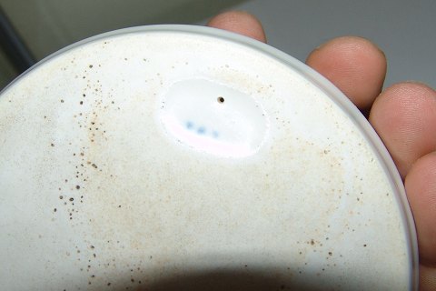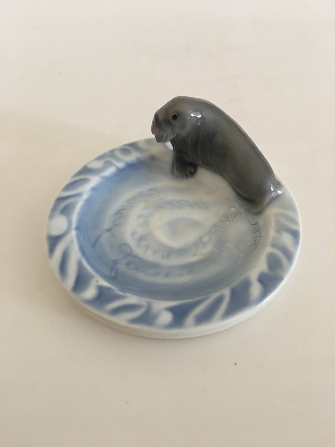 Bing og Grøndahl Art Nouveau Askebæger med Hvalros. Måler 12cm. Svært at læse inskription, men noget med Rudolf Jensen 1899 24 April.... Har brændingsfejl