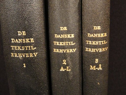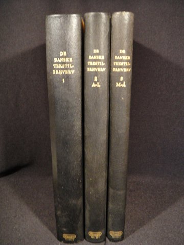 BJØRN, HELGE & E. ZINKLAR ZINGLERSEN (RED.). De danske tekstilerhverv. Faglig, biografisk håndbog for tekstilerhvervene i Danmark. 1-3. 3 bd. Udarbejdet i samråd med erhvervenes institutioner og organisationer. Forlaget Liber, København 1965-66. 549+600+335 pp. Med fotos og illustrationer. Indbundet Orig. Halvlæder med guldtryk og øvre guldsnit. Første udgave.