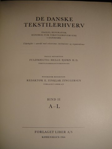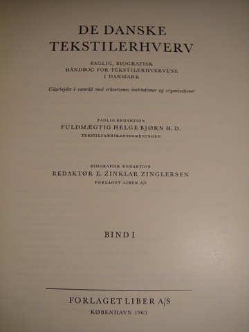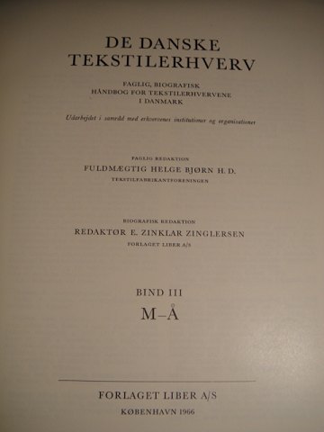 BJØRN, HELGE & E. ZINKLAR ZINGLERSEN (RED.). De danske tekstilerhverv. Faglig, biografisk håndbog for tekstilerhvervene i Danmark. 1-3. 3 bd. Udarbejdet i samråd med erhvervenes institutioner og organisationer. Forlaget Liber, København 1965-66. 549+600+3