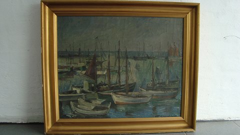 Maleri af J.P. Starberg - Havneparti med fiskekutter og joller.