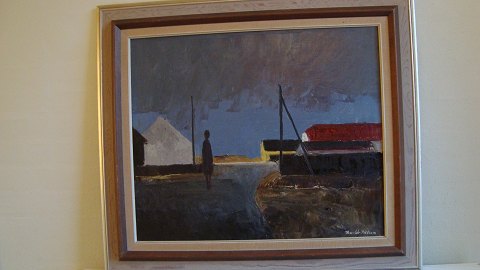 Maleri af Jørgen Budde Nielsen - Person og bygninger i landskab.