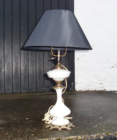 Olielampe omlavet il el af hvid opaline gals, monteret op messing fod med græsk evigheds mønster.