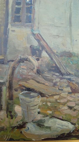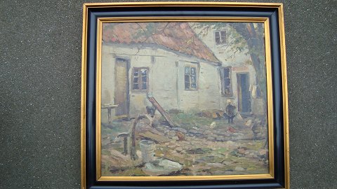 Maleri af Einar Gross - Gårdeksteriør med dreng og høns.