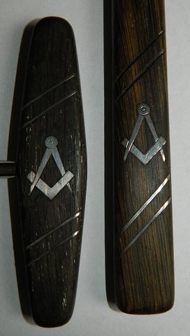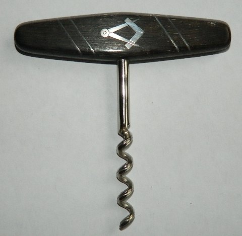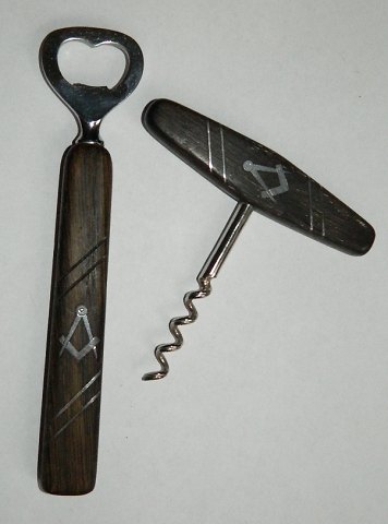Proptrækker og oplukker i palisander. Fremstillet hos Lundtofte Stål. Dekoreret med frimurersymbol i sølv. Et par "streger" på oplukkeren mangler. Oplukkeren er 17 cm lang.