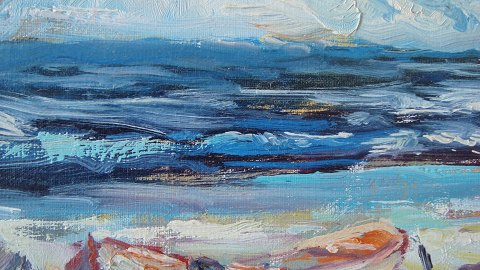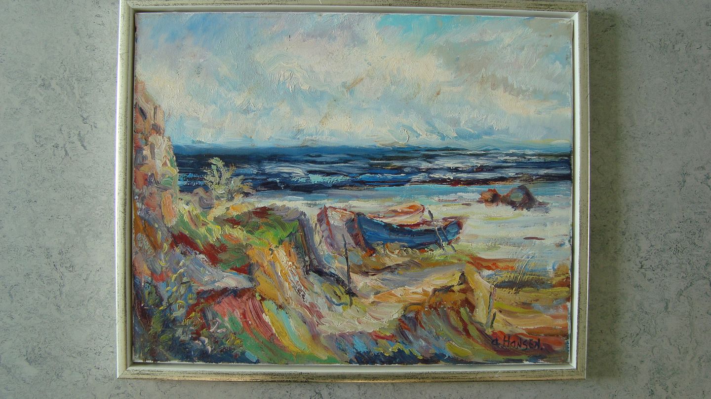 Maleri af Alex Hansen - Kystparti med optrukne både på stranden.