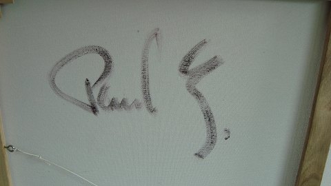 Maleri af Paul Erik Johansen - Komposition med lilla mand siddende på hug.