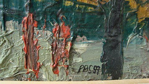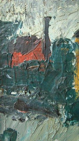 Maleri af Peder Brøndum Sørensen - Byparti med huse og personer 1959.