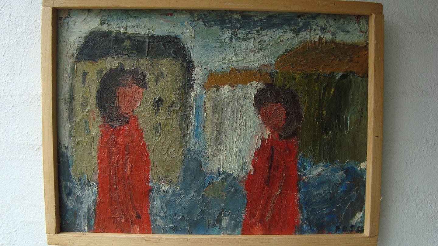Maleri af Peder Brøndum Sørensen - Landskab med huse og personer 1955.