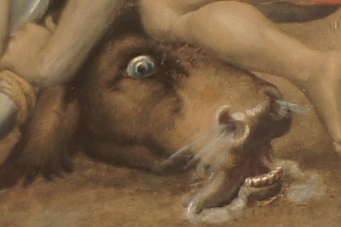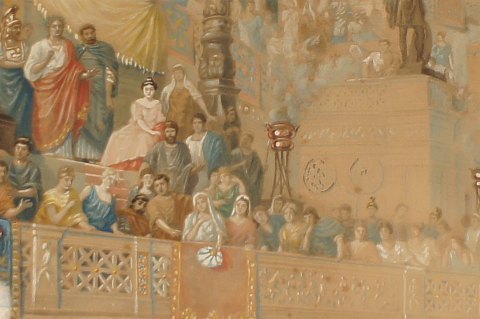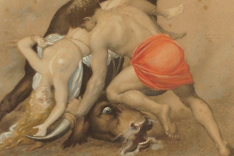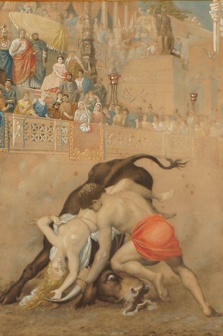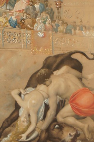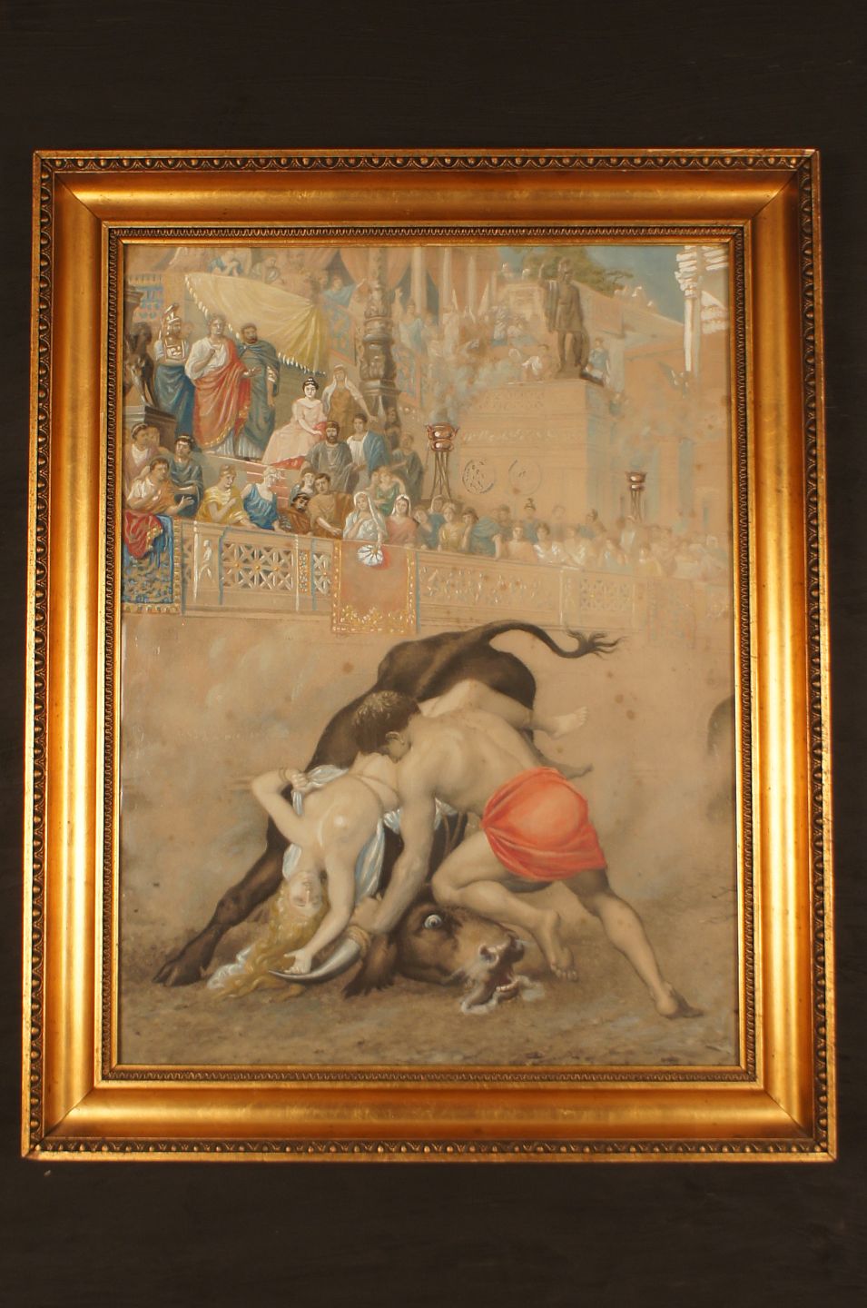 Her tilbydes et mixed media på papir. Dramatisk scene fra romersk arena.