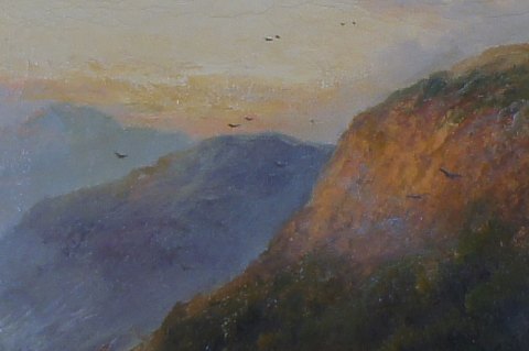 Daniel Sherrin (f. 1868, d. 1940) Skotsk landskab. Sign. D. Sherrin. Olie på lærred. 51 x 76. Rammen er 12 cm. bred. I god stand, enkelte krakkeleringer. Smuk, bred guldramme med enkelte små afslag. Priseksempel : Et maleri af Daniel Sherrin, blev solgt hos Tennants i 2003 for $ 9,381.