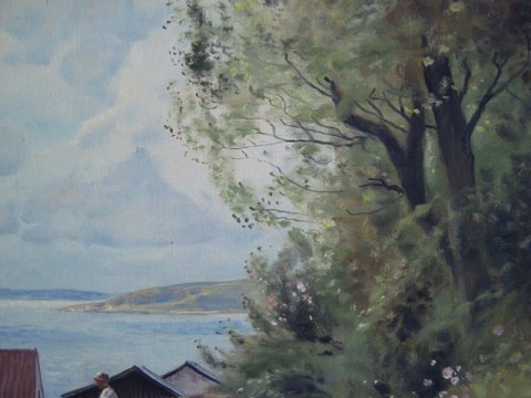 Maleri af Niels Walseth - Sjællandsk kystparti med pige ved fiskerhus.