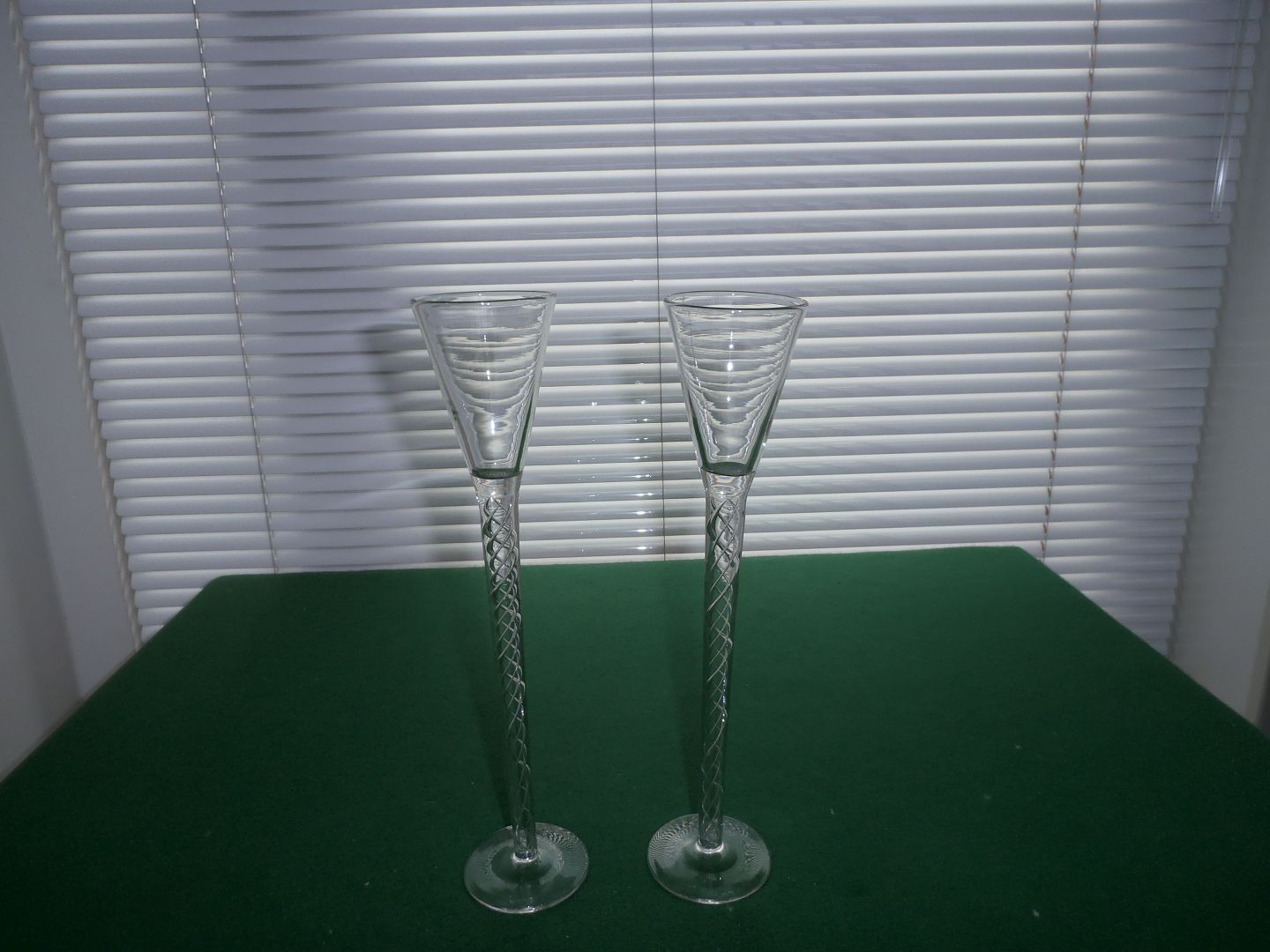 1 par 30cm. høje Holmegaard snapseglas m. indvendigt snoet stilk, Danmark ca. 1920.