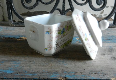 Fransk 1800tals sukker skrin, dekoreret med blomster og tekst Suiwenir, bliver også kaldt nonne porcelæn.