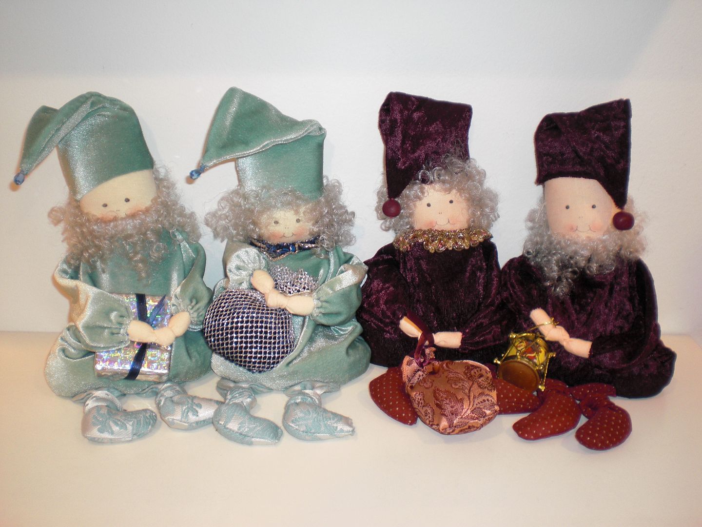 4 kunstneriske håndlavede nisser med risfyld i fløjlsdragter - 2 nissemænd og to nissekoner. Længde: 32 cm.