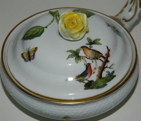 Kasserolle med hank og låg i porcelæn fra Herend, Ungarn. Dekoreret med modelleret gul rose på toppen af låget samt bemalet dyr bl.a. sommerfugle og fugle. Fremstår i god stand uden skader eller reparationer. Fabriksmærket på bunden. Mål: Fra bund til toppen af rosen på låget: 7½ cm. Fra bordplade til toppen af håndtaget 8 cm.
