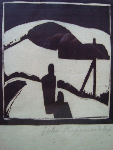Text available in Danish: Linoleumssnit af Johannes Hofmeister - Personer i landskab.
