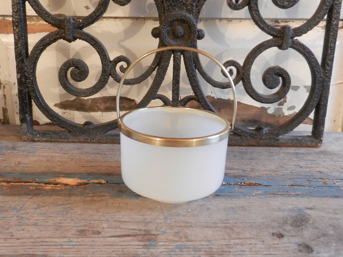 1800tals sukkerskål af hvid opalineglas med messing hank.
