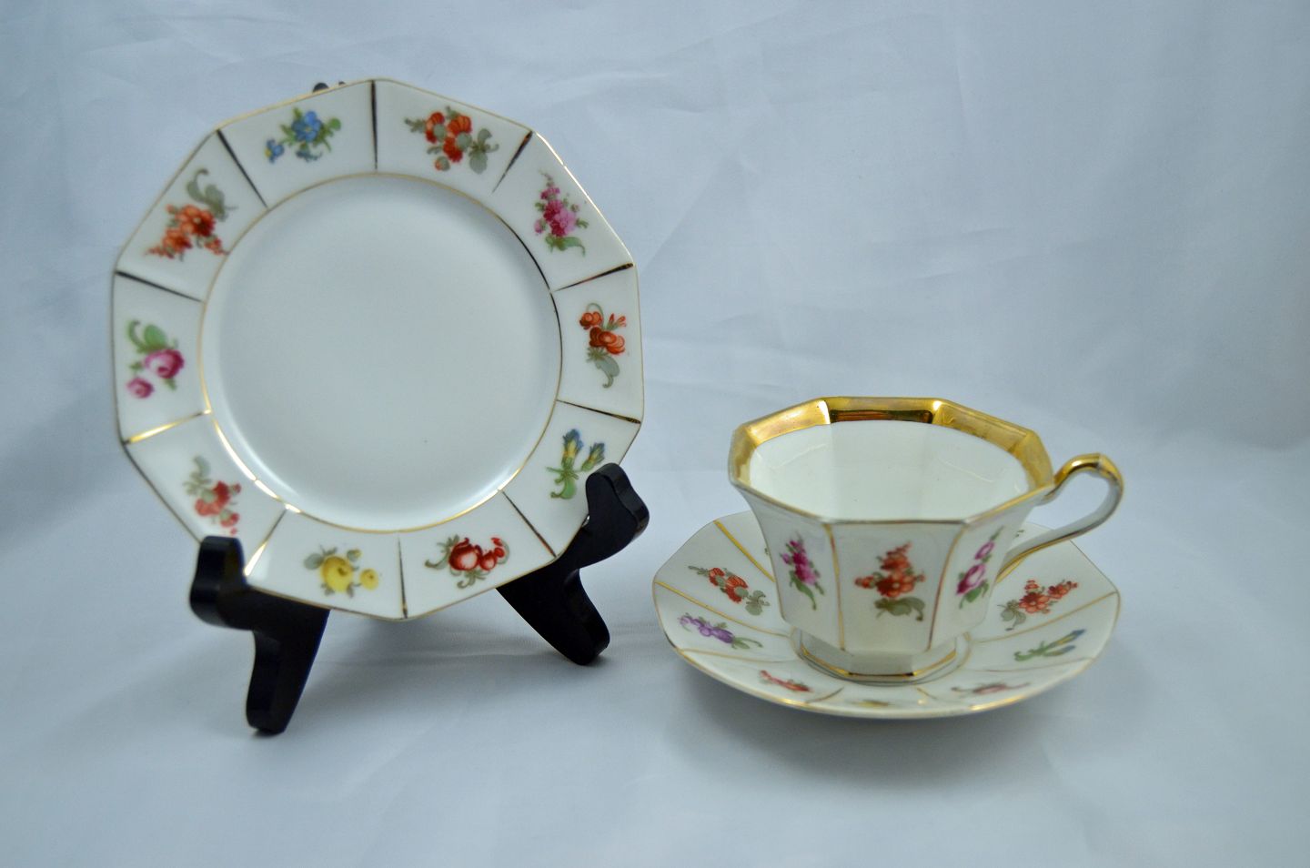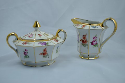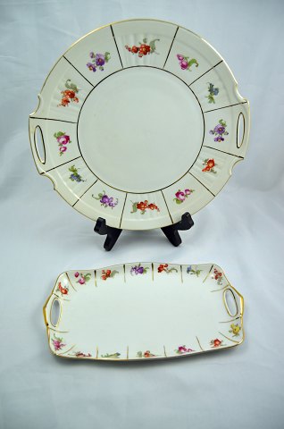 Text available in Danish: Charmerende stel Bavaria "Tirschenreuth". Mange forskellige dele. 10 sæt Kopper, underkopper og Kagetallerkener. forskellige kagefade, sukkerskål og flødekande med underfad.