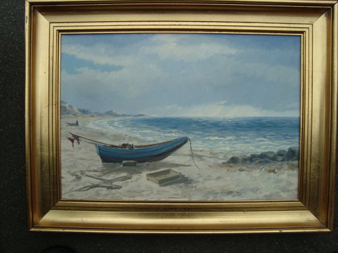 Maleri af E. Thorbjørn - Strandparti med optrukne fiskerbåde.