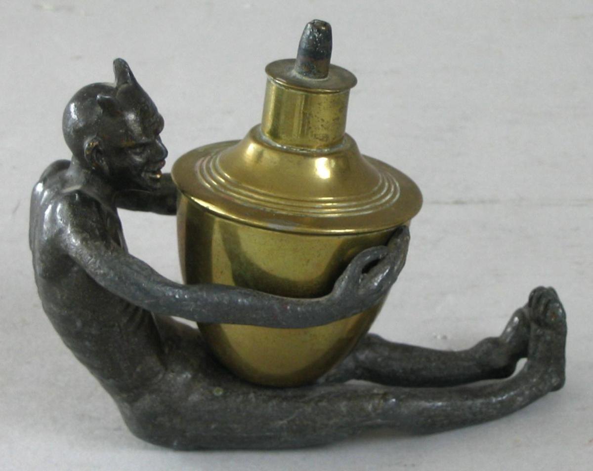 Olielampe, 19. årh, i form af siddende djævel med oliebeholder i messing. Figur af metal. L.: 11 cm. H.: 10 cm.