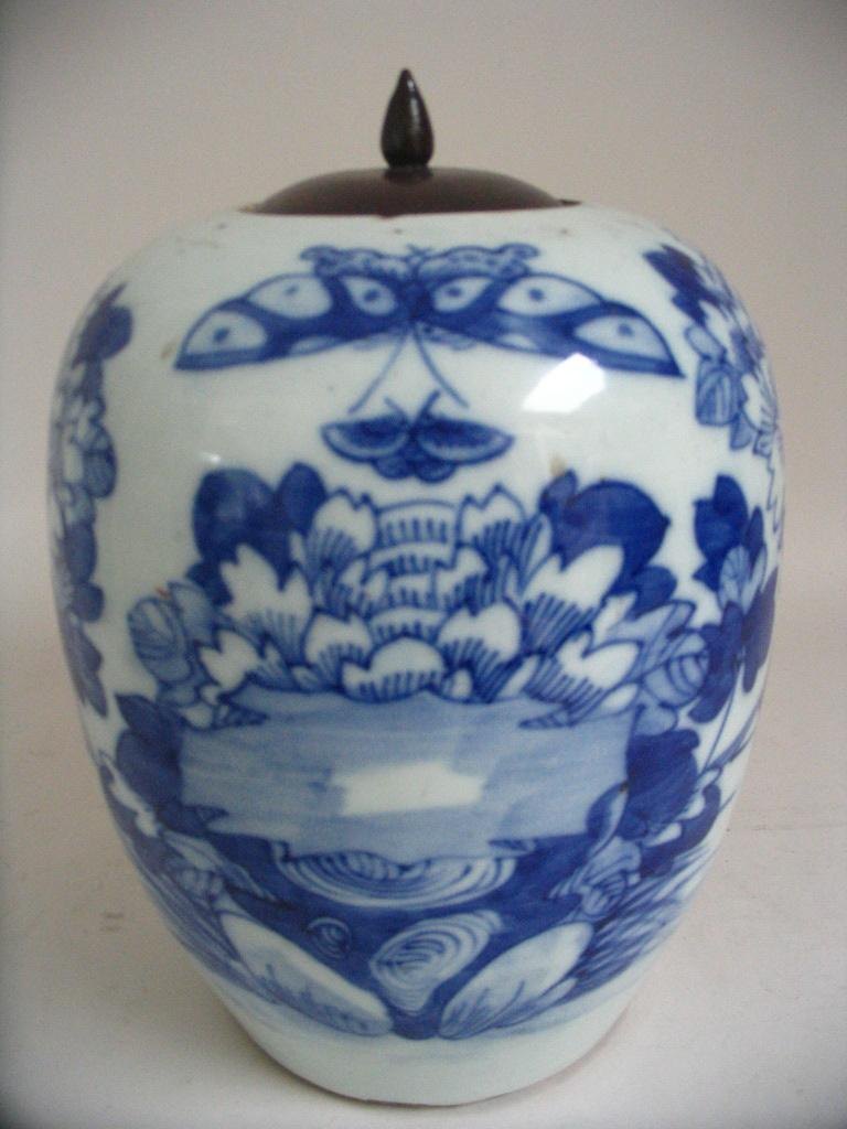 Stor kinesisk bojan i porcelæn, 19. årh. Dekoreret i blåt med vandplanter og sommerfugle. H.: 27 cm. Dia.: 23 cm. Med nyere trælåg.
