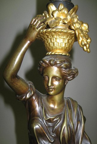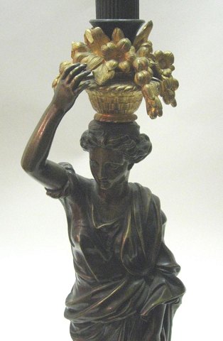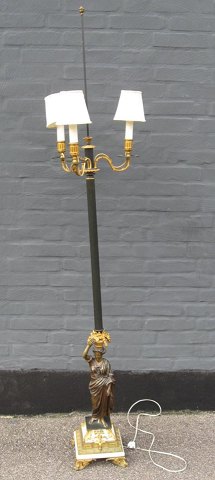 Standerlampe i patineret og forgyldt bronze, Frankrig, Charles X, 19. årh., Fodstykke med fire bronzeben med bladværk, base i hvidt marmor mellemstykke med kyriatide med kurv på hovedet med frugter, kannelleret stamme med tre svungne arme. H.: 185 cm.