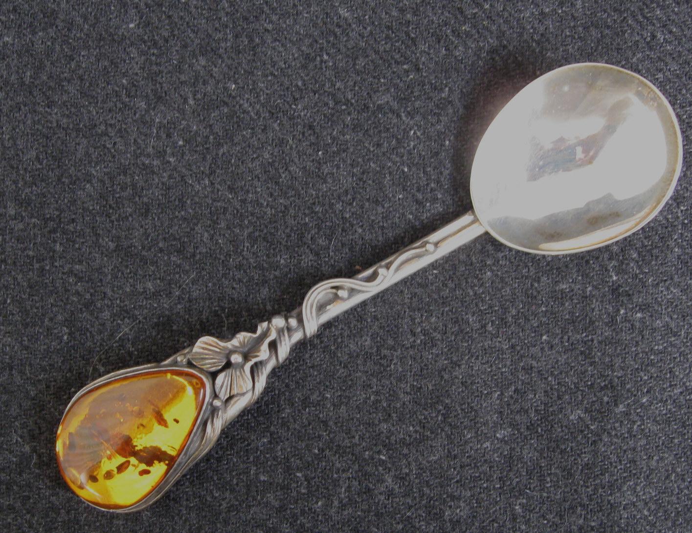 Marmelade ske i sølv, o. 1950, dekoreret med slomster og ranker og ravklump. Stemplet 925 S. L.: 13 cm. Samlet vægt.: 26 gram.