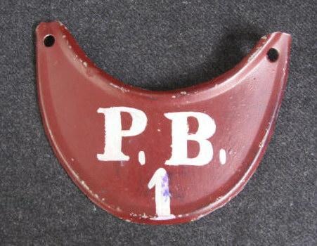Brandskilt i metal, bemalet, med påskervet.: P.B. 1. For.: Præstø Brandvæsen, no. 1 (for brandfogeden). L.: 13,5 cm. H.: 9 cm.