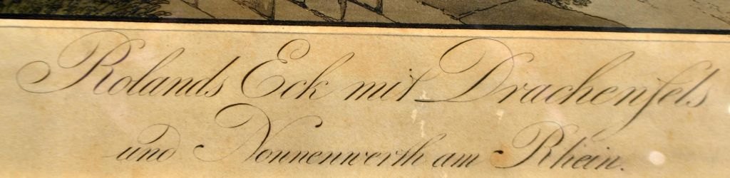 Håndkoloreret topografisk aquatinte af Carl Wizani (1767 - 1818), Tyskland, af Rolands Eck mit Drackenfels und Nonnenwerth am Rhein. Med trykramme. Signeret. Udgivet af Kunstverlag L. v. Kleist in Dresden. 35 x 50 cm. I nyere guldramme.