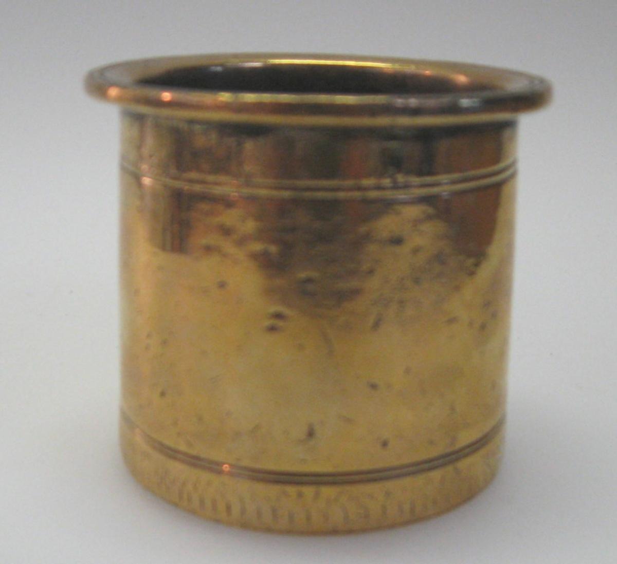 Tibetansk klosterbæger i messing, 1600-tallet. Antagelig et blækbæger. Let konisk og med ombøjet kant. Dekorationer på sider, top og fod. H.: 6,8 cm. Proveniens: Givet til loge i Odense.