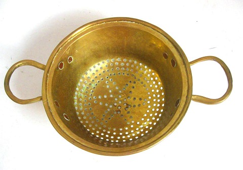 Dørslag i messing, 19. årh. Med hanke. Huller i bund i stjernemønster. Dia.: 22 cm. L.: 34 cm.