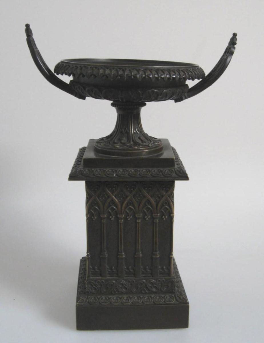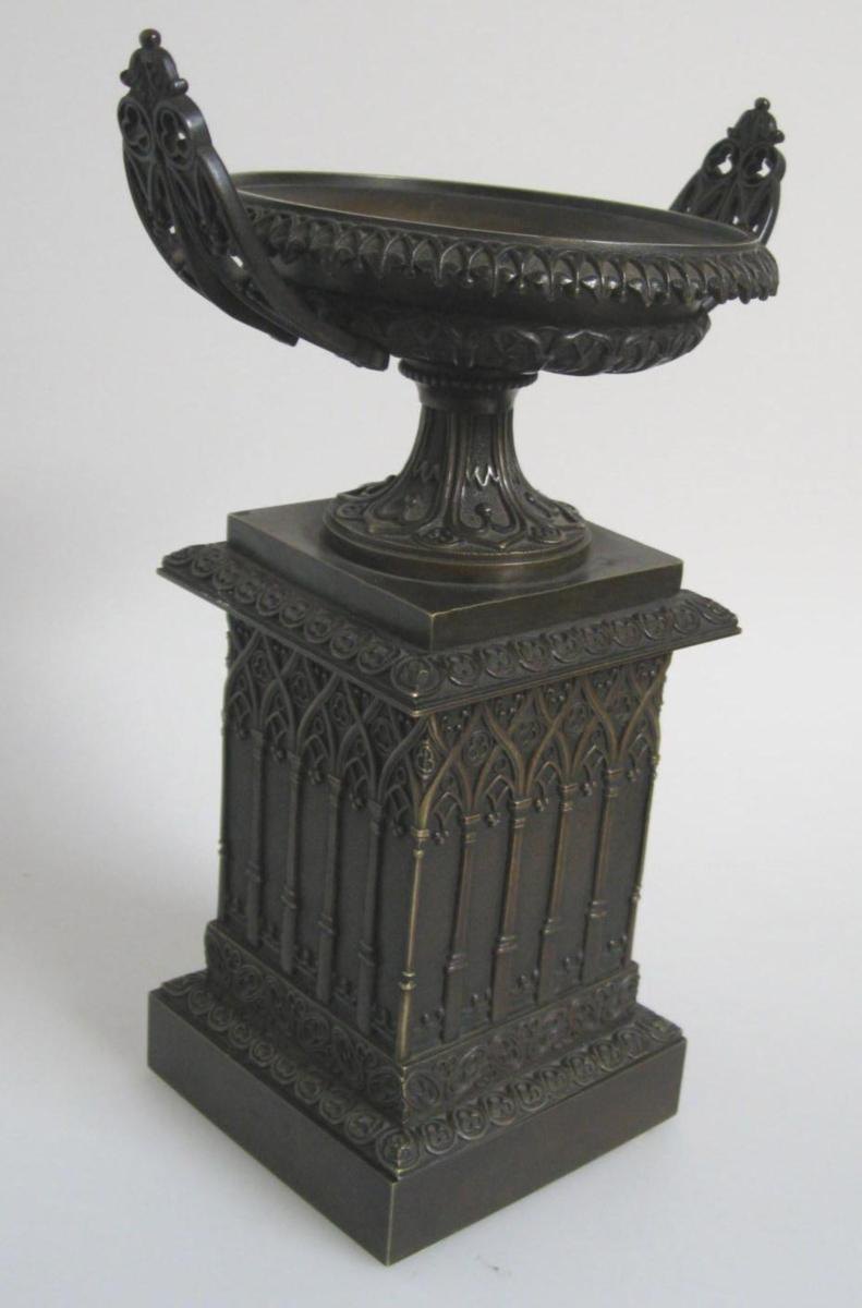 Tazza i bronze, gotisk stil, 19. årh. Flamboyant stil. Kvadratisk fodstykke med ribber, derpå øreskål med gennembrudte hanke. H.: 27,5 cm. Antagelig Frankrig. Fantastisk stykke.