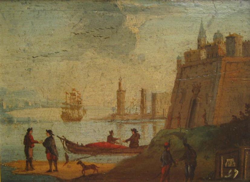 Italiensk kunstner (17. årh.) En fortificert italiensk havneby med folkeliv og et stort sejlskib i lagunen. Olie på poppel. 16 x 21 cm. Signeret nederst til højre på sten.: PS 37.