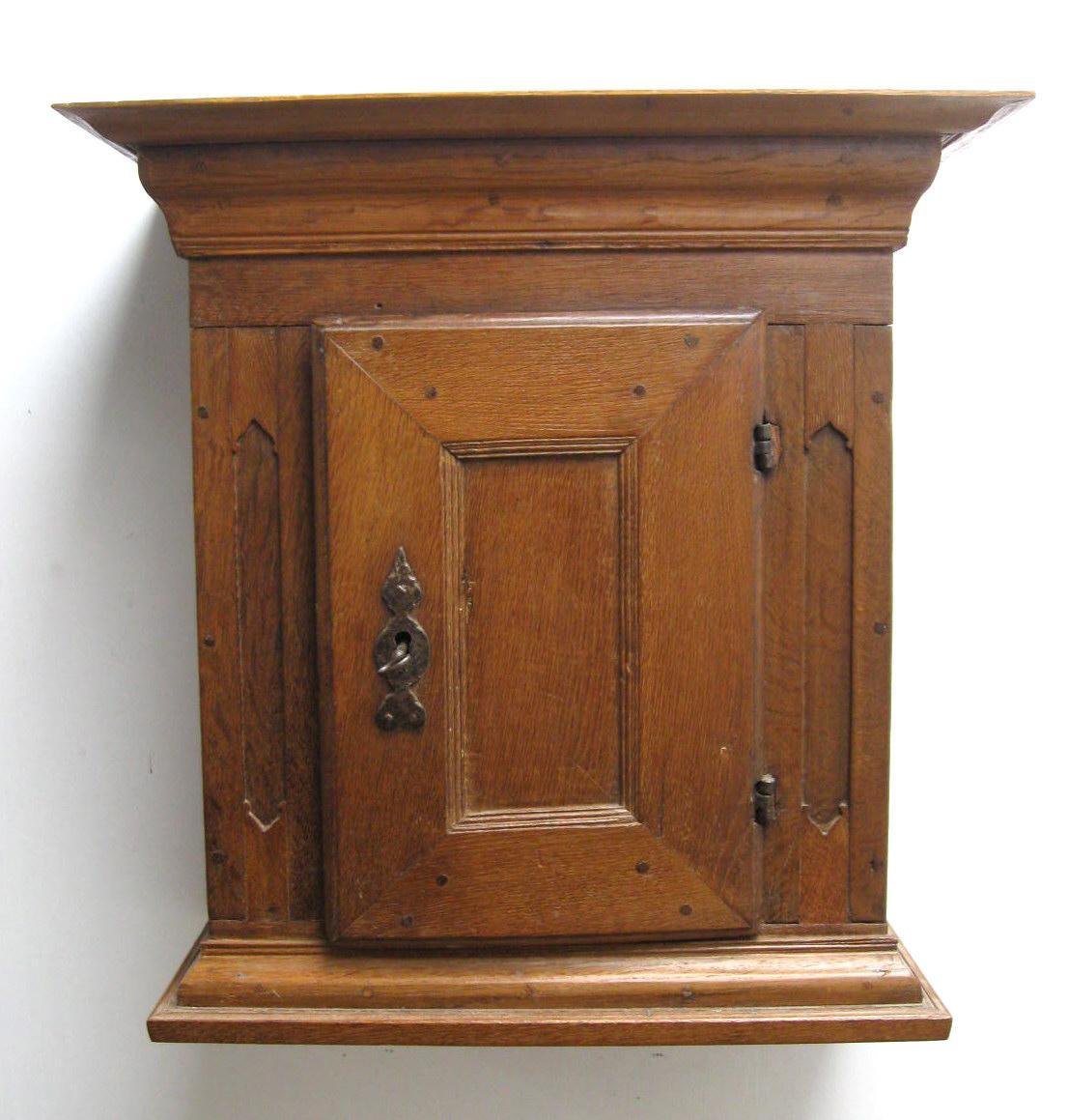 Hanger cabinet in oak wood, Denmark, 18th century. Baroque, with cranked moldings, door and original latch. Polished oak. H: 64 cm. B: 55 cm. D: 28 cm.