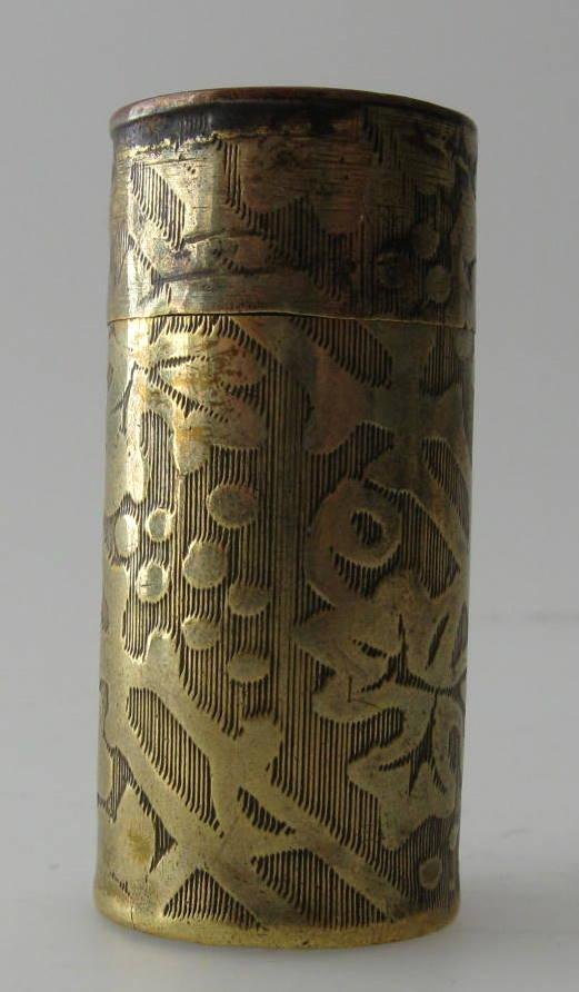 Tændstikholder i messing, Kina, 19. årh. Med dekorationer. H.: 5 cm. Cylinderformet.