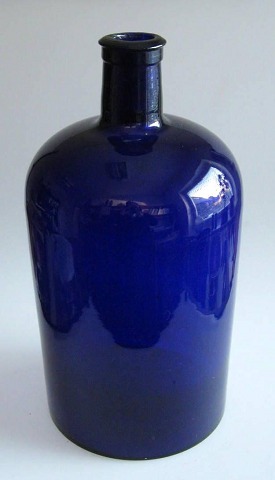 Petroleums flaske, cobolt blå glas, Danmark, o. 1900. H.: 35 cm.