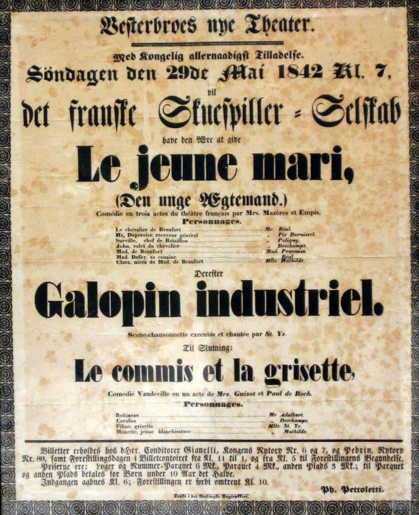 Teater plakat, Vesterbroes nye Teater, København, 1842. Opførsel af det franske skuespiller-selskab. Opførelse: Le jeune mari, Galopin industriel og Le commis et la grisette. Underskrevet teaterdirektør Ph. Pettoletti. 52 x 38 cm. Trykt hos Berlingske Bogtrykkeri. I nyere sort ramme.